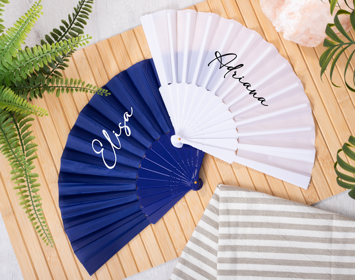 Si quieres sobrevivir al calor del verano, solo necesitas una cosa: ¡tu propio abanico personalizado! Sin duda, este accesorio será tu mejor aliado durante estos meses del año donde el sol está en pleno apogeo y no nos da ni un respiro. Hazte con este original abanico que está disponible en dos colores (azul oscuro y blanco) y vive el verano de otra manera. Y lo mejor de todo es que podrás poner tu nombre en él para darle un toque único y diferente. ¡Es lo más! Para poder personalizar este abanico, primero añade el producto al carrito. Después, cuando entres en nuestro diseñador, solo tienes que escribir el nombre que tú quieras en el área de color blanco y colocarlo a tu gusto. ¡Tendrás el mejor abanico del mundo! Material: plástico. Medida: 42 x 23 centímetros.