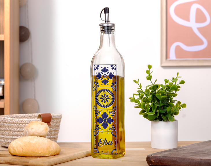 ¿Eres de los que aman los utensilios de cocina elegantes y con estilo? ¿Quieres convertir tu cocina en un rincón con encanto gracias a los pequeños detalles? Entonces, esta aceitera de cristal personalizada es perfecta para ti. Sin duda, destacarás con ella. También encaja a la perfección como pieza decorativa para el hogar. Su diseño de mosaico combina formas geométricas y un color azul ideal, inspirado en la tradición mediterránea. Aporta un toque artístico, estético y atemporal, convirtiéndose en un detalle que realza cualquier cocina. Una pieza llena de alma, pensada para quienes cocinan con amor y arte. Puedes personalizarla con un nombre, lo que la convierte en un regalo original único. Añádela al carrito, escribe el nombre que prefieras y así de fácil, tendrás un detalle funcional para tus recetas y decorativo para esa cocina tan especial. Altura de la aceitera: 24,5 cm. Capacidad aproximada: 500 ml.