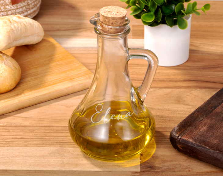 El aceite es el mejor compañero de cualquier cocinillas, y esta aceitera de cristal personalizada con tapón de corcho es justo lo que necesitan en su cocina. Perfecta para ese amigo que acaba de comprarse su primera casa o para el compi de piso que empieza a experimentar con recetas. Pero lo que realmente la hace única es que se puede personalizar con el nombre o texto que tú quieras. Nosotros lo grabamos en la botella, para que sea un regalo aún más especial y personal. Imagina la ilusión de tener tu propia aceitera personalizada, lista para darle sabor a cada plato. Regalar esta aceitera es acertar seguro. Un detalle original, útil para quien esté estrenando casa o buscando dar un toque especial a su cocina, sin duda se convertirá en su aliada perfecta. Y personalizarla es muy sencillo: añade el producto al carrito y entra al área de personalización. Allí podrás escribir el nombre o texto que quieras en la aceitera. ¡Un regalo original para cualquier ocasión! Altura: 15 cm Capacidad: 250 ml Tapón: corcho natural
