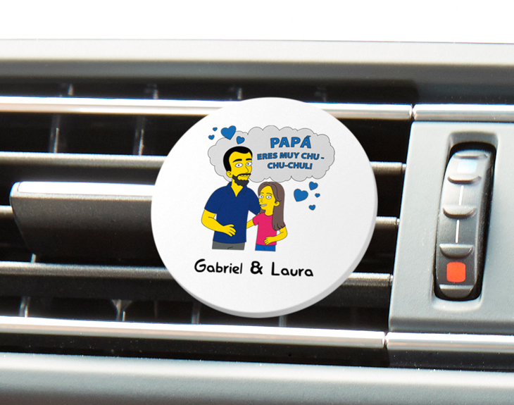 ¿Papá es el chofer de la familia? ¿Pasa mucho tiempo en su coche yendo de aquí para allá? ¡Tenemos el regalo perfecto para sorprenderlo en su día! Nuestro adorno para aire acondicionado personalizado con un diseño inspirado en "Padre Simpson". Sin duda, será el detalle más original que haya recibido. Con este diseño, podrás representar a tu padre y a ti como si fuerais una familia de Springfield. ¡Vuestros propios personajes inspirados en la famosa serie de Los Simpson! Quedará genial y, sin duda, le hará mucha ilusión a papá. Este adorno original de metacrilato incluye un clip para colocarlo fácilmente en la rejilla de ventilación. Así, podrás darle un toque personal a su coche y disfrutar de recuerdos especiales en cada trayecto. Ya sea para su cumpleaños o para el Día del Padre, este será un regalo original que le encantará. Personalizar este adorno para coche es muy fácil. Lo primero es añadir el producto al carrito y entrar al área de personalización. Una vez ahí, ya podrás crear a estos avatares con los rasgos y accesorios que más os representen. Nosotros nos encargamos de que quede listo para regalar. Importante: El adorno es un elemento únicamente decorativo.