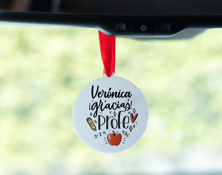 Llega el final de curso, y ¿quieres mostrarle todo tu agradecimiento a tu profe? Después de un año lleno de dedicación, paciencia y cariño, ¡es el momento perfecto para darle las gracias por todo lo que ha hecho! Y qué mejor manera de hacerlo que con un detalle único, emotivo y que le recuerde tu cariño cada día. Nuestro adorno colgante personalizado con la frase "Gracias Profe" es el detalle perfecto para transmitir todo lo que significa para sus alumnos. Un accesorio original para el coche que, además de ser bonito, lleva consigo un mensaje lleno de emoción. Con un diseño pensado especialmente para los mejores profes, este colgante será un detalle que seguro adorará. Y lo mejor: puedes personalizarlo con su nombre, haciendo que sea aún más especial. Ahora, cada trayecto al instituto será un recordatorio de cariño y agradecimiento. ¿Cómo se personaliza? Muy sencillo. Añade el producto al carrito y entrar al área de personalización. Allí, escribe el nombre del profe en el recuadro en blanco indicado y listo. Pronto estará perfecto y listo para regalar. ¡Será un original regalo para profesores!