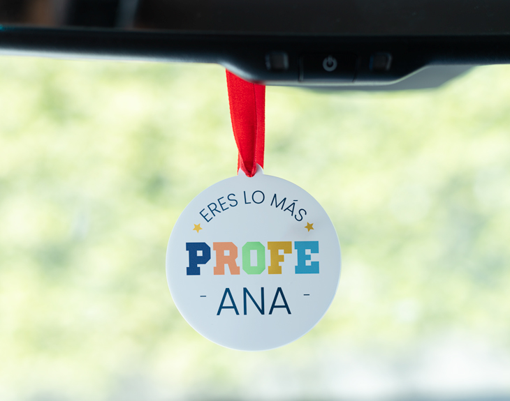 ¿Quieres sorprender a tu profe con un detalle único al final del curso? Tenemos la idea perfecta para que cada trayecto en coche le saque una sonrisa: nuestro adorno colgante personalizado. Un regalo original, con un diseño alegre y emotivo, ideal para colgar del retrovisor y recordarle cada mañana cuánto cariño le tiene su clase. Porque ser profe no es tarea fácil: implica dedicación, paciencia y mucho corazón. ¡Y por eso se merece un detalle especial! Este colgante tiene el tamaño perfecto para decorar el coche sin molestar, y además, se puede personalizar con su nombre justo debajo de la frase: "Profe, eres lo más". Un detalle pensado para ese profe que lo ha dado todo este año. Personalizarlo es muy sencillo. El primer paso a seguir consiste en añadir el producto al carrito y entrar al área de personalización. Allí, escribe el nombre del profe en el recuadro en blanco que dejaremos, y listo. Pronto estará perfecto y listo para regalar. ¡Será un original regalo para el coche!
