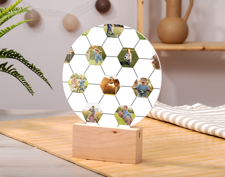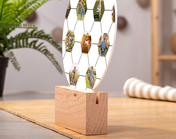 El fútbol es un deporte que cuenta con millones de aficionados en todo el mundo, así que seguro que conoces a alguien que ama este deporte por encima de todo. Y es que si quieres sorprenderle, lo único que tienes que hacer es regalarle este adorno de metacrilato personalizado en forma de balón de fútbol. ¡Es el mejor regalo que podrás hacerle! Te aseguramos que si quieres triunfar con un regalo, solo necesitas este original adorno. Es ideal para dejar sin palabras al entrenador de fútbol de tus hijos, para un cumpleaños, el amigo invisible... ¡Cualquier momento es bueno para regalarlo! Y lo mejor es que podrás decorar cualquier rinconcito gracias a la base de madera que viene incluida para poder sujetarlo. ¡Es lo más! ¿Cómo puedes personaliar este adorno? Si accedes a nuestro diseñador, solo tendrás que añadir tus imágenes favoritas en los espacios vacíos, colocarlas a tu gusto y listo. Con estos sencillos pasos, tendrás el mejor regalo para cualquier aficionado al fútbol y que además le encantará. Diámetro del adorno: 15,5 cm.