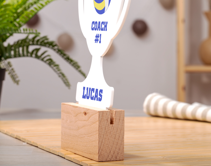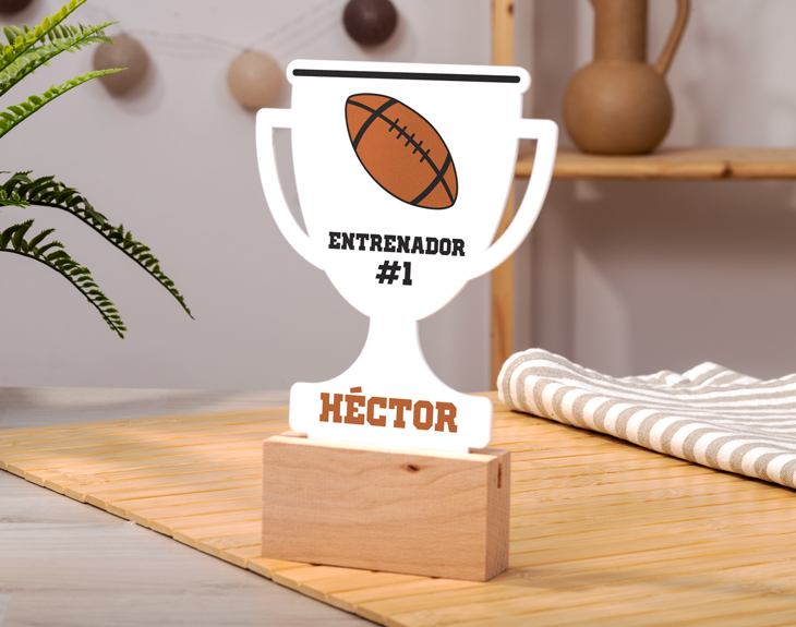 Hay personas que prefieren practicar un deporte y otras simplemente, disfrutarlo desde el sofá. No importa si eres de una cosa, de la otra o de ambas, porque si alguien te regala este adorno de metacrilato personalizado en forma de trofeo, significa que amas los deportes por encima de todo. Y es que es el mejor regalo que puedes hacerle a cualquier aficionado. Sin duda, este original adorno es perfecto para triunfar en cualquier ocasión: un cumpleaños, el amigo invisible, una celebración importante... Será la opción perfecta para regalar y dejar sin palabras a quien lo reciba. Además, gracias a la base de madera que trae como soporte, podrás colocarlo en cualquier rincón para darle un toque único. ¡Es lo más! Para personalizar este adorno, lo único que tienes que hacer es elegir el deporte que más te guste y escribir el nombre que quieras, todo esto dentro de nuestro diseñador. Será súper fácil y en segundos lo tendrás todo preparado y listo para recbirlo. Diámetro del adorno: 17 x 13 cm.