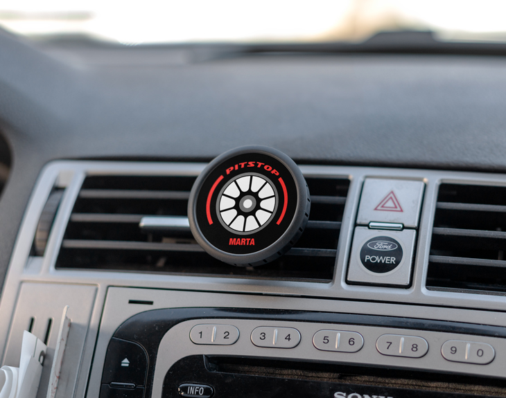 Si la velocidad es lo tuyo y disfrutas como nadie de la Fórmula 1, este ambientador personalizado no podrá faltar en tu coche. Y es que su diseño inspirado en las ruedas de este tipo de competición seguro que te roba el corazón, además de aportarle algún que otro caballo extra a tu coche y hacer que huela delicoso. ¡Es lo más! Si tú también conoces a esa persona a la que le apasionan los coches y todo lo que tenga que ver con ellos, este original ambientador es el mejor regalo que puedes hacerle. Es perfecto para conseguir que el coche huela genial, gracias a las perlas con aroma a limón que incluye en su interior. ¡Y podrás elegir el diseño que más te guste! Personalizar este ambientador es muy sencillo. Entra en el área de personalización, escoge el color del diseño que más te guste, añade el nombre que quieras y estará listo para regalar. Sin duda, será el detalle perfecto para cualquier ocasión. ¡No habrá regalo mejor! Importante:las perlas del ambientador están metidas en una bolsita. Para que el aroma sea más intenso, te recomendamos abrirla. Además, una vez gastadas, puedes reutilizarlo añadiendo nuevas perlas con tu olor favorito. Aroma: limón. Medidas: 5 cm x 5 cm.
