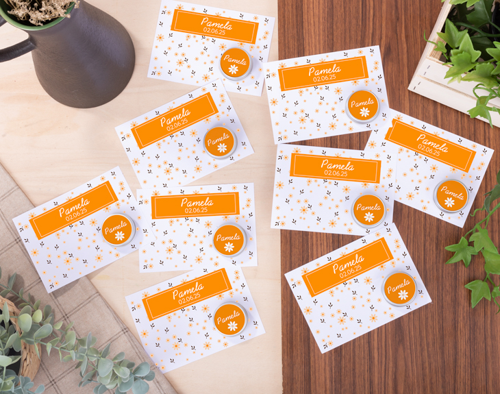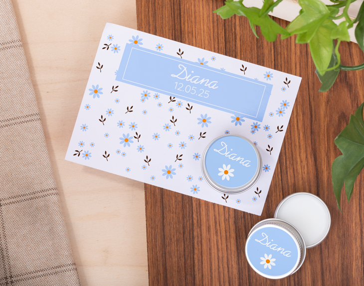 ¿Estás buscando un detalle para los invitados de la Primera Comunión de tu hijo/a? ¿Quieres dejarles sin palabras con algo único? Sorpréndeles con estos preciosos bálsamos labiales con tarjeta que les dejarán sin palabras. Porque además de ser un recuerdo único de este día, también es un regalo útil que podrán utilizar siempre que quieran. Aprovecha este tipo de celebraciones para agradecer a tu familia y amigos que compartan este momento con vosotros a través de este original regalo que le gustará a todo el mundo porque es bonito y práctico. Podrás entregarle a cada persona su propio bálsamo labial con una tarjeta y todo ello personalizado con este precioso diseño de florecitas de colores. Para poder personalizar estos bálsamos con tarjeta, solo tienes que completar los siguientes pasos. Elige cuántas unidades quieres y añádelas al carrito. Una vez dentro del área de personalización, vas a poder elegir qué diseño te gusta más y completarlo con el texto que quieras. Nosotros nos encargamos de que quede perfecto y listo para regalar. ¡Será el mejor regalo del mundo! Medidas: - Diámetro: 4 centímetro. - Alto: 1,5 centímetro.