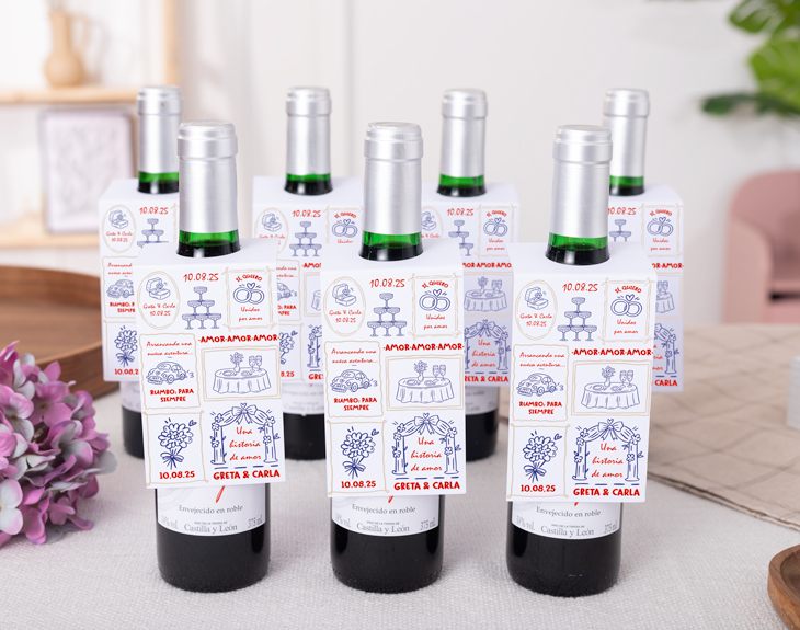 Cada boda es un momento único e inolvidable, y el recuerdo que dejes en tus invitados marcará la diferencia. Si buscas un detalle original y con personalidad para tu gran día, nuestras mini botellas de vino o cava personalizadas con diseño "Dibujos de boda" son la opción perfecta. Estos pequeños benjamines, disponibles en vino o cava, se convierten en recuerdos de boda ideales para sorprender a familiares y amigos. Lo mejor es que son completamente personalizables: podrás añadir vuestros nombres, la fecha y un mensaje especial para hacer que este detalle refleje la magia de vuestra celebración. Personalizar estas mini botellas es muy sencillo. Solo tienes que añadir el producto al carrito y acceder al área de personalización, donde podrás escribir el texto que desees. En poco tiempo tendrás un recuerdo original de boda, para que tus invitados guarden para siempre ese día tan especial.