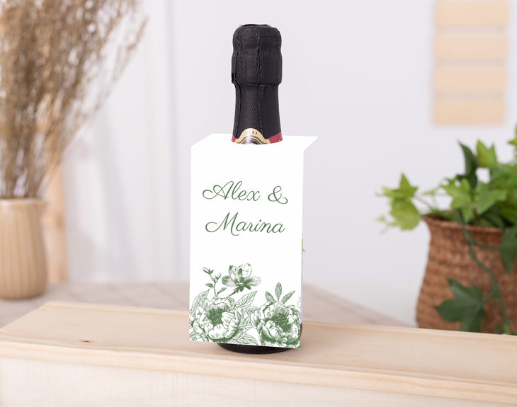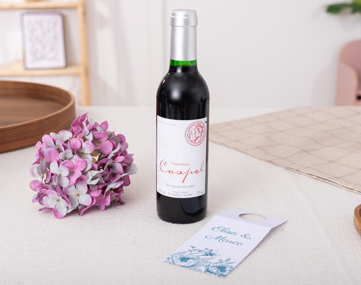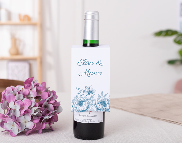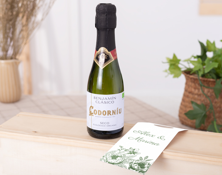 En la mayoría de las celebraciones de boda, tiramos la casa por la ventana, porque el amor no se celebra solo un día, sino cada día que se comparte. Y para brindar en ese gran día y en todos los que vendrán, tenemos esta benjamín de cava o vino con tarjeta personalizada, delicadamente decorada con las flores del estampado Toile de Jouy. Un diseño que hará que ese amor florezca con elegancia y delicadeza eternamente. Un amor clásico y romántico, como los finos trazos del Toile de Jouy, merece celebrarse y compartirse con las personas que más queremos. Por eso, esta mini botella de cava o vino es perfecta para la ocasión. A tus invitados les encantará su diseño cuidado y ese toque de sofisticación que la hace única. Es el regalo para aniversario, bodas ideal: original, elegante y con mucho significado. Al añadirla al carrito, solo tienes que elegir entre cava o vino, el que más te apetezca para brindar en tu gran día, seleccionar el diseño que más te guste y personalizar la tarjeta con el texto que desees. Sin duda, quedará preciosa. ¡Todos quedar encantados! Gramaje del papel: 300 gr.