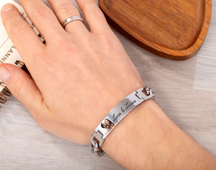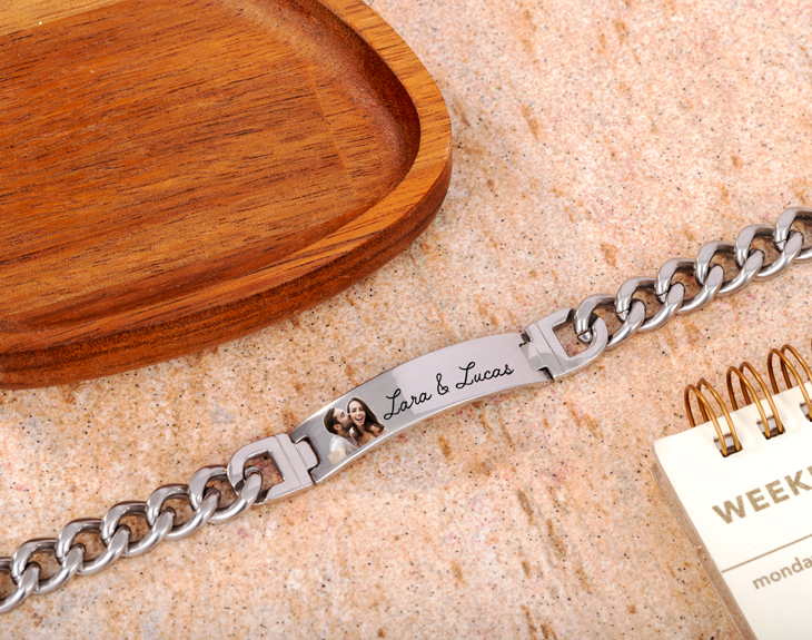 ¿Quieres sorprender a tu pareja con un detalle que pueda llevar siempre muy cerca del corazón, esta vez en su muñeca? Esta pulsera de plata personalizada con foto y texto es una de las ideas más románticas que existen: un acierto seguro que le hará muy feliz. Se trata de un regalo original perfecto para cualquier ocasión especial, como San Valentín, un aniversario o simplemente para recordarle lo maravillosa que es esa persona. Un gesto lleno de cariño y admiración que, sin duda, le encantará. Hazla completamente única personalizándola con un nombre, una fecha o una frase corta que capture vuestra historia, junto con una foto especial. Y para que sea aún más inolvidable, puedes añadir una elegante caja premium, disponible en varios diseños para que elijas el que mejor exprese tus sentimientos. Personalizarla es muy fácil: solo tienes que seleccionar la opción que mejor se adapte al regalo que quieres hacer y completar los campos de personalización disponibles. Sea cual sea tu elección, acertarás seguro con esta pulsera con foto y texto, que la acompañará a todas partes y cuyo diseño es tan atractivo como moderno. Longitud: 21 cm
