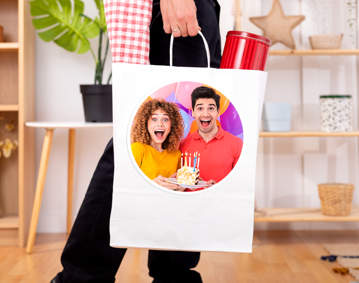 Dale el último toque a ese regalo especial con esta bolsa de papel personalizada. Será perfecta para que la experiencia de entregar el regalo sea inolvidable. La bolsa se vinila con la fotografía o el mensaje que desees. Nosotros pensamos firmemente que tan importante es el regalo como la entrega, por eso nos encanta esta bolsa personalizada. Altura de la bolsa: 41 cm.