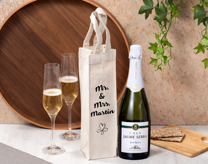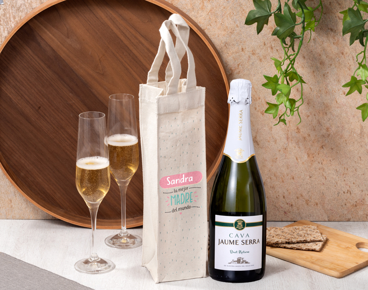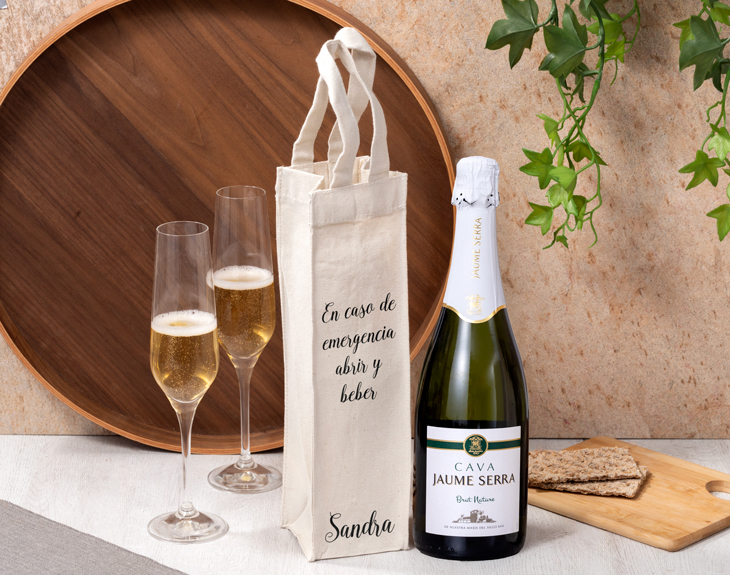 • Bolsa de tela para botella personalizada. • Botella de vino Azpilicueta 75 cl o botella de cava Jaume Serra 75 cl (Opcional). • Tarjeta Recordatoria.