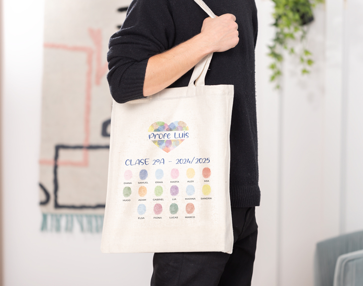 Este fin de curso, sorprende a tu profe con un detalle que une cariño y utilidad: una bolsa tote personalizada con el diseño “Huellitas corazón clase”. Una forma preciosa de decir “gracias” por todo lo vivido durante el año… y perfecta para acompañarle en sus próximas aventuras entre libros, cuadernos y sonrisas. Esta bolsa de tela original es ideal para llevar material escolar, libros, apuntes o incluso ese tupper que nunca falta en la sala de profesores. Y lo mejor es que estará decorada con los nombres de su clase, formando un gran corazón lleno de huellas imborrables. ¡El regalo perfecto para profesores! Personalizarla es muy sencillo: entra en el área de personalización, elige la cantidad de huellas de alumnos quieras y añade sus nombres. Podrás adaptarlo a tu gusto para que quede justo como imaginas. Nosotros nos encargamos de prepararla con todo el mimo que se merece. Porque hay profesores que dejan huella… y esta bolsa es una forma de recordárselo cada día. ¡Feliz fin de curso!