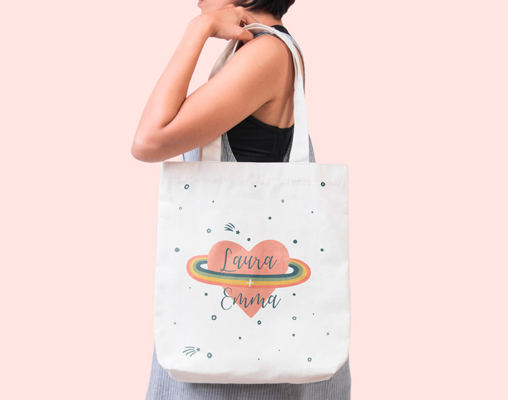Si vuestro amor es más bonito que el arcoíris, ¡házselo saber a tu pareja! Y no solo a él/ella, sino a todo el mundo: vuestro amor es amor. Con esta bolsa tote personalizada, pasearás orgulloso/a siempre con vuestra unión. ¡El regalo ideal para San Valentín o vuestra cita! Sorprende a tu pareja preparando ese picnic tan especial y lleva todo contigo en esta bolsa de tela tan espaciosa. ¡Podéis llevaros dos idénticas! Así siempre estaréis como en el diseño: juntos. Dinos vuestros nombres y nosotros los inmortalizamos en este precioso corazón. Pasea orgulloso/a vuestro amor cuando vayas al trabajo, al gimnasio o al campo. Cada vez que os veáis, llevad en esta totebag todo lo que necesitéis para que vuestro amor siga siendo tan bonito como en este dibujo personalizado exclusivamente para vosotros.