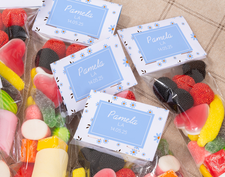 Tu hijo/a se merece celebrar su Primera Comunión por todo lo alto y eso incluye que los invitados estén contentos y se lo pasen genial en este día tan importante. Endulza este momento con estas deliciosas bolsitas de chuches personalizadas que serán las auténticas protagonistas además del regalo perfecto para tu familia y amigos. ¡Les encantarán! Si quieres que tus invitados nunca olviden este día, solo tienes que regalarles estas originales bolsitas llenas con un surtido de chuches que gustarán a todo el mundo. Son perfectas para seguir con la celebración y darle un toque de lo más dulce a esta fecha tan especial. ¿A quién no le gustaría recibir un regalo así? Pero lo mejor de todo es que podrás personalizar las etiquetas de estas bolsitas para dales un toque único y muy guay. Elige la cantidad que quieras antes de añadirlas al carrito y después, desde el área de personalización podrás escoger el disñeo que más te guste y completarlo con el texto que quieras. ¡Triunfarás seguro! Medidas: 22 x 7,5 centímetros. Peso: 125 gr.