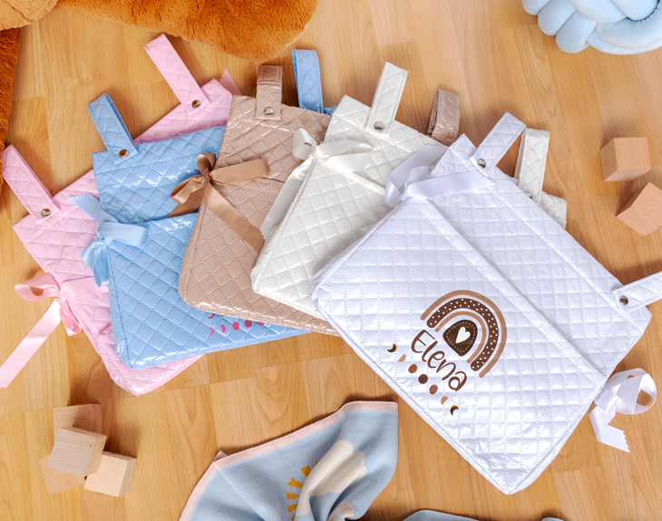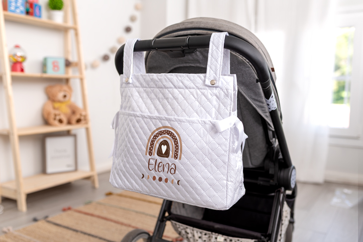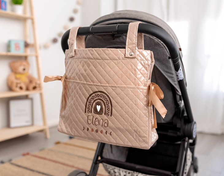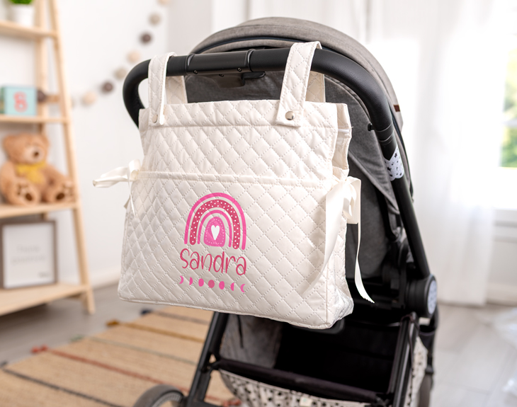 Ser padres es, sin duda, una de las experiencias más bonitas de la vida. Y con ella llega la ilusión de preparar cada pequeño detalle para ese bebé que está a punto de llegar. Nuestro bolso para carrito de bebé personalizado es uno de esos accesorios imprescindibles en esta nueva etapa. Está fabricado en polipiel acolchada, un material resistente, impermeable y fácil de limpiar. Perfecto para el uso diario: desde paseos por el parque hasta como bolso de hospital. Si estás haciendo tu lista de imprescindibles, este no puede faltar. Además, es un acierto total como regalo para recién nacidos. Lo tiene todo: práctico, bonito, útil y vas a triunfar con este detallazo. Solo tienes que elegir el diseño de arcoíris que más te guste y añadir el nombre del bebé. ¿El resultado? El regalo estrella de la celebración. Todos lo adorarán, y los papás más todavía. Es compatible con cualquier cochecito o silla de paseo, e incluye asa larga ajustable, broches de presión para colgarlo del carrito y cierre de cremallera. Cómodo, seguro y con espacio suficiente para llevar todo lo necesario sin preocuparte por nada. Y personalizarlo es tan fácil como divertido: añádelo al carrito, selecciona el color del bolso que quieras, escoge tu diseño favorito en el área de personalización, escribe el nombre del bebé y listo. En pocos días tendrás en casa el regalo para nacimientos original, que todas las mamis y papis que lo vean, van a querer uno igual. Cuidados recomendados para mayor durabilidad: Limpiar con un paño húmedo y un poco de jabón neutro si hace falta. No lo laves a máquina ni lo sumerjas en agua. Evita exponerlo al sol durante mucho tiempo para que no se desgaste el color. Medidas: 31,5 cm x 37 cm. Medida asas: 26 cm. Colores disponibles: rosa, azul, blanco, crema y marrón.