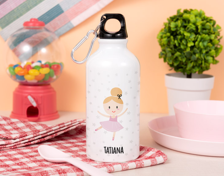 ¿Tu peque empieza el cole y quieres que lo haga con buen pie? ¿Necesitas sorprender a una amiga con un regalo original, bonito y práctico? Con nuestra botella Forest personalizada Bailarina Ballet lo tendrás más que fácil. La posibilidad de personalizarla con el nombre de la destinataria convierte a esta botella en un regalo de lo más exclusivo. El diseño de la botella ya es precioso de por si. Y es que esta elegante botella, de estilo vintage, está fabricada en acero inoxidable y revestida en un elegante color blanco, que hará que el diseño destaque con toda intensidad. Cuenta con un tapón a rosca con detalles en madera y una asita, que pone la guinda a esta decoración tan cuidada y estilosa. Lo mejor, por supuesto, es que podrás personalizar la botella con el nombre de la persona. Su diseño, en el que aparece una tierna bailarina rodeada por estrellitas grises se completa con el nombre que quieras debajo del dibujo. Solo tienes que pulsar en el símbolo + que encontrarás en el diseñador y anotar el texto. La imagen que ves en pantalla, se trasladará directamente a tu nueva botella, ¡lista para sorprender a quien más quieres! No hay regalo más práctico para tus seres queridos que una botella que puedan usar en sus clases, trabajo o incluso en el gimnasio. Pero si deseas que, además de práctico, sea un regalo original, no dudes que la opción de personalizarlo conseguirá su objetivo. La destinataria se enamorará de su preciosa bailarina, sobre todo si ella misma es una apasionada del baile. ¡La llevará a todas partes y, cada vez que la use, se acordará de ti! Altura de la botella: 22,5 cm. Diámetro de la base de la botella: 7,3 cm. Capacidad: 620 ml. Material: Acero inoxidable.