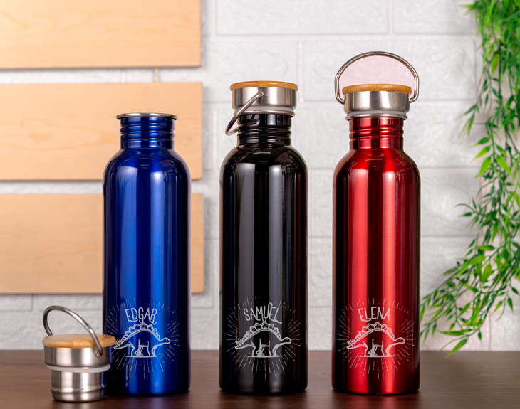 Todos conocemos a alguien que está obsesionado con beber determinados litros de agua al día. Si tú también tienes a alguien cerca que se pasa el día con una botella de la mano, este regalo original tiene su nombre. ¡Y es que así podrá tirar de una vez las típicas botellas de plástico y pasarse a usar esta de acero inoxidable tan especial! Además de tener un diseño minimalista precioso, es de un material mucho más sano y favorable para el medio ambiente...¡Son todo ventajas! Para personalizarla únicamente tendrás que decirnos el nombre del destinatario y nosotros nos encargamos de insertarlo justo encima de este dinosaurio tan divertido. ¡Se quedará sin palabras al verlo! Puedes escoger entre nuestros tres colores el que más te guste: negro, rojo o azul.¡Tú decides! Altura de la botella: 24,2 cm. Capacidad: 800 ml. Material: Acero inoxidable.