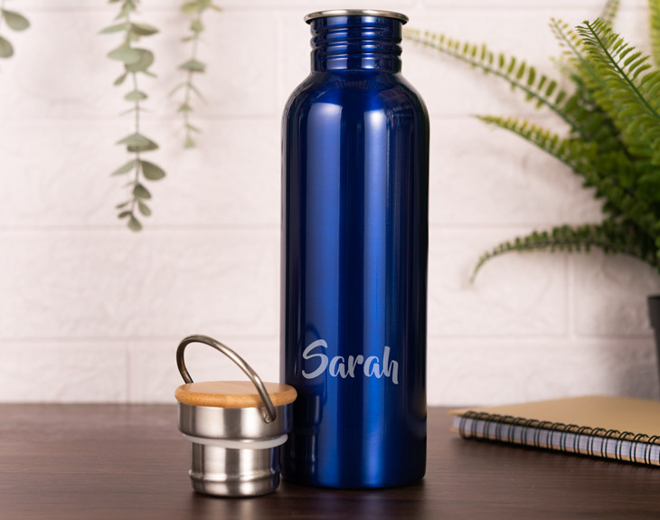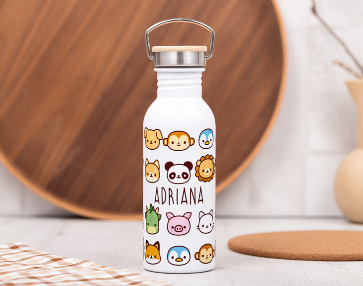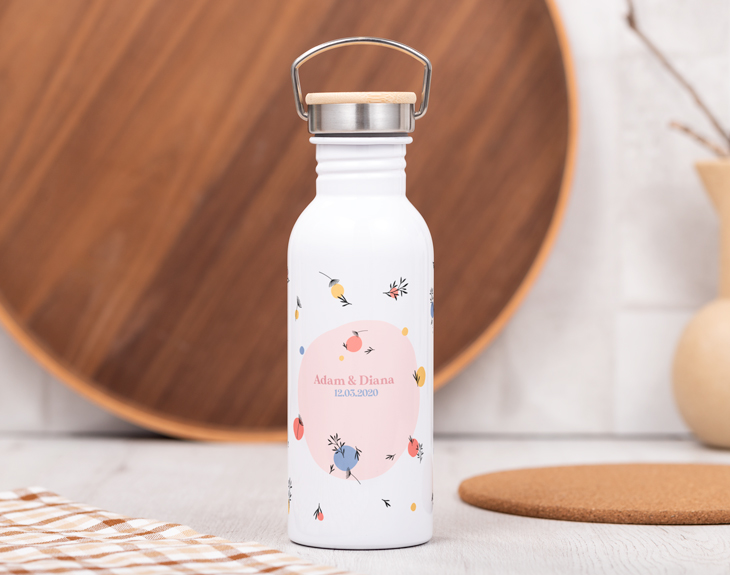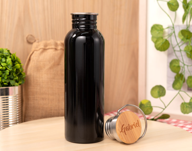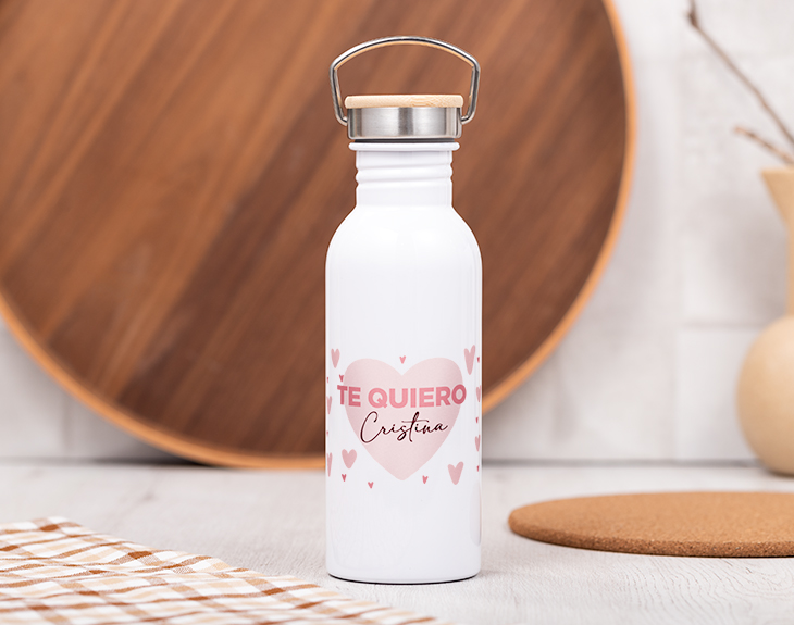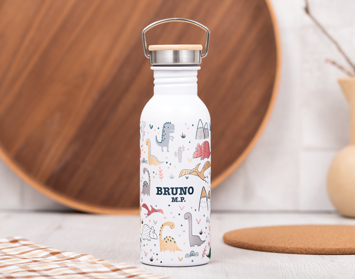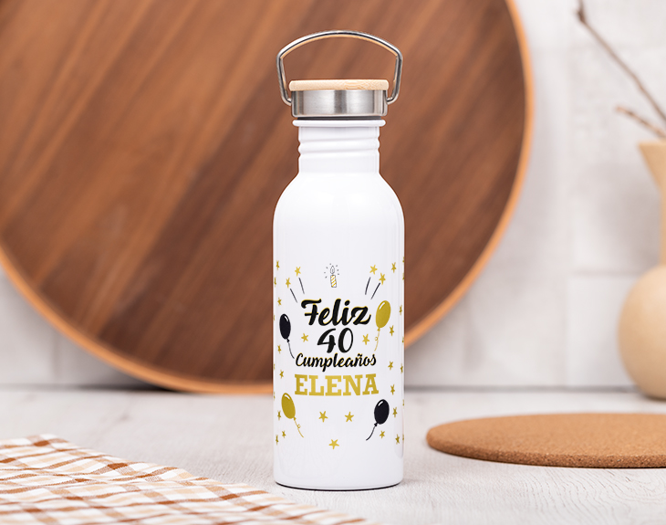 ¿Botellas reutilizables? ¡Por supuesto que sí! Ha llegado el momento de regalar la botella de agua personalizada más especial de todas. Y es que, además de ser respetuosa con el medio ambiente y mucho más saludable, tiene un diseño retro que enamorará allá donde vaya. ¿Lo mejor de todo? ¡La personalizaremos con su inicial y nombre! Se trata de una botella de acero inoxidable y con un tapón con detalles en bambú ideal para utilizar en el día a día. Podrás transportarla fácilmente y sin preocupaciones, ya que cuenta con un asa y un tapón de seguridad para evitar derrames. Sin duda, la mejor opción si estás buscando un regalo original y muy práctico. Además, nuestras letras botánicas en color dorado y con un diseño floral hará que se convierta en la botella más elegante de todas. Minimalista y con ese toque vintage que tan de moda está, ¡seguro que no sale de casa sin ella! Altura de la botella: 22,5 cm. Diámetro de la base de la botella: 7,3 cm. Capacidad: 620 ml. Material: Acero inoxidable.