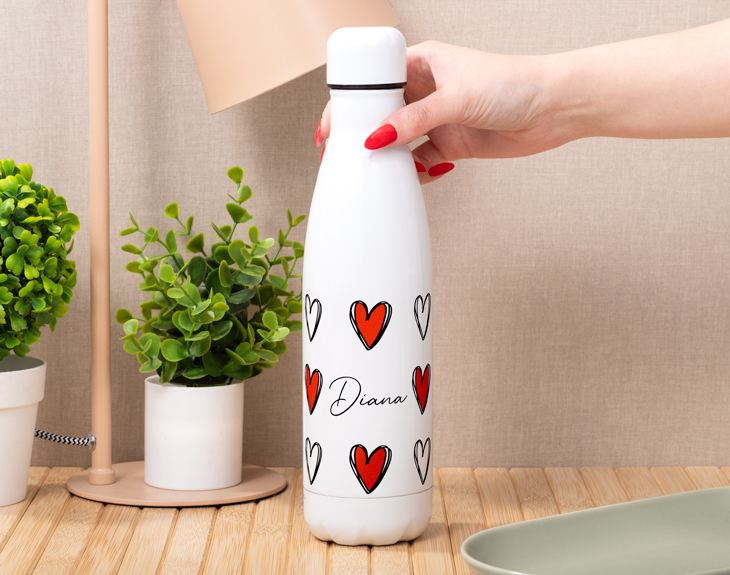En todas las estaciones del año (y más en los meses de calor) es muy importante beber mucha, mucha agua. Qué mejor forma de hidratarse que nuestra botella Nature personalizada, porque se puede ser romántico en cualquier época del año. Es un diseño inmejorable y un regalo original para sorprender a aquellos que queremos, por supuesto a tu pareja, pero también a tu padre, madre, hermana o un amigo muy, muy especial. Con el diseño con corazones en forma de dibujo rojos y blancos, la botella Nature personalizada aguanta el frío gracias a su tapón antiderrame. Con una capacidad de 500 ml es perfecta para saciar esos sofocos que nos afectan tanto por el calor como por el amor. En nuestro diseñador podrás incluir el nombre de tu pareja, tu familia o tu amigo para poder hacer de esta botella un regalo original único y refrescante. Solo tienes que añadir el producto al carrito, pulsar en la barra de personalizar y listo ¡A diseñar! Altura de la botella: 25,5 cm. Diámetro de la base de la botella: 6 cm. Capacidad: 500 ml. Material: acero inoxidable.