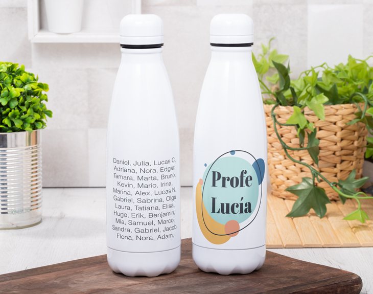 Cuando llegan las vacaciones de verano significa que el curso escolar ha llegado a su fin. No más deberes, ni exámenes, ni tener que estudiar. Pero hay que reconocer que seguro que vais a echar de menos a vuestro profe, el que os ha acompañado durante todo el año y os ha enseñado tantas cosas. Por eso, para que no se olvide de vosotros y sepa lo agradecidos que estáis, se merece un regalo tan guay como esta botella personalizada Nature. Es el regalo ideal para cualquier profe porque seguro que quiere utilizarla todo el día, tanto para ir a clase como en su tiempo libre. ¡Todo el mundo querrá una igual! Esta original botella es genial para que vuestro profe sea respetuoso con el medio ambiente y reduzca el uso de plástico. Es reutilizable, de acero inoxidable y cuenta con un tapón para evitar derramar el líquido de dentro. Es ligera y muy resistente por lo que es la botella ideal para todos los días. Estamos seguros de que este diseño conquistará el corazoncito de tu profe y se convertirá en su botella favorita hasta el momento. ¡Querrá utilizarla todos los días! Personalizar esta botella es muy sencillo. Añade el producto al carrito y entra en el área de personalización. Después empieza a crear tu diseño. Rellena los espacios vacíos con el texto que quieras y colócalo todo para que quede perfecto. Una vez hecho esto la botella ya estará lista para entregar. ¡Tendrá el mejor regalo del mundo! Altura de la botella: 25 cm. Capacidad: 790 ml. Material: Acero inoxidable.