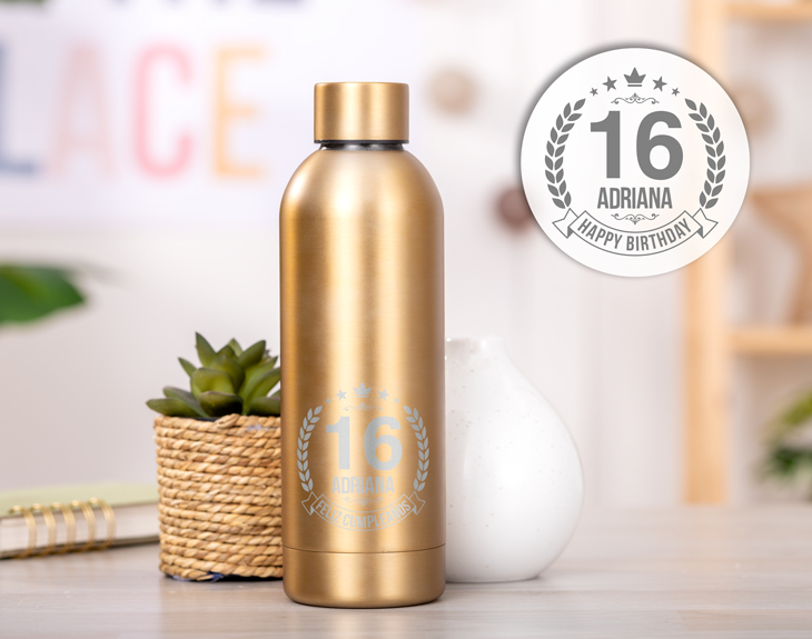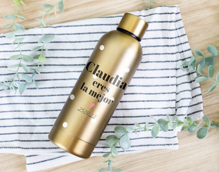 La poesía es uno de los aspectos más complicados dentro de la literatura. Requiere una capacidad increíble para llegar a lo más profundo de nuestro ser, y escribir nuestros sentimientos de una forma estilosa y de lo más elegante. Lo mejor es hidratarse todo lo posible para que no se nos olvide ni una sola coma. Por ello contamos con esta botella vip personalizada, con la que no tendrás ningún problema a la hora de escribir cualquier obra. Esta botella está hecha para los más creativos de la casa, para aquellas personas que siempre tienen que tener una pluma en la mano y necesitan toda la hidratación del mundo. Para todos ellos, esta botella de acero inoxidable con colores metálicos es perfecta. Cuenta con una altura de 22 centímetros y una capacidad de 550 mililitros. ¡Más de medio litro de tu bebida favorita cabrá en este recipiente! Este regalo original no solo es elegante y estiloso gracias a su color metalizado, sino también gracias a la tipografía de su personalización. ¡Parece escrita con una mítica pluma! ¿Cómo podrás incluir el nombre de esa persona tan creativa en este producto? Una vez añadas el producto al carrito, podrás acceder al portal de personalización, donde podrás escribir el nombre de esa persona en el cajón de respuesta. ¡Nosotros nos encargaremos de crear un regalo único y duradero para él o ella! La botella cuenta con doble pared y aislamiento de cobre al vacío. Esto quiere decir que tus bebidas podrán mantenerse frías o calientes durante más tiempo, conservando su temperatura original. Altura de la botella: 22 cm. Diámetro de la base: 6,5 cm. Capacidad: 550 ml. Color: a escoger. Material: Acero inoxidable.