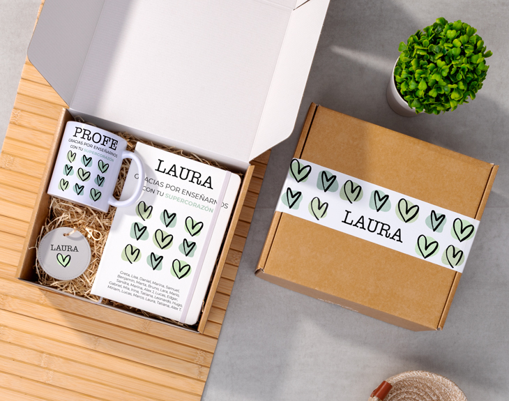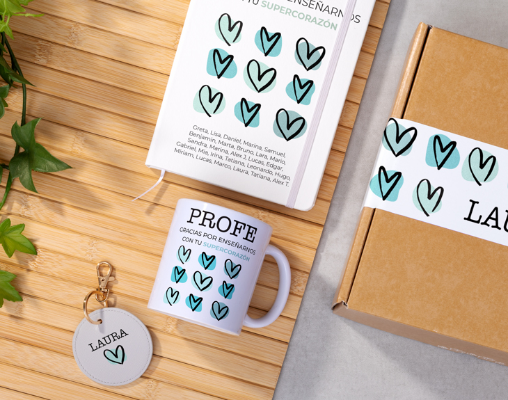 ¿Estáis buscando un regalo para agradecer a la mejor profe del mundo todo lo que ha hecho por vosotros? Si este curso habéis tenido la suerte de coincidir con una increíble profesional que ha sabido enseñaros desde el corazón, esta caja de esenciales del profe personalizada tiene su nombre. Incluye todo lo necesario para su día a día, un precioso bloc personalizado para apuntar tareas, un elegante llavero para no perder las llaves de clase y una taza para disfrutar de su café en esas largas tardes corrigiendo exámenes. Seguro que a partir de ahora se convierten en sus indispensables, ¡no saldrá de casa sin ellos! Con la ayuda de nuestro diseñador podréis personalizarla rápidamente, por una parte os pediremos el nombre para el llavero y para la pegatina, por otra, el texto para el cuaderno. Ahí podréis incluir los nombres de todos los alumnos, de esta manera guardará para siempre un bonito recuerdo de sus alumnos favoritos. Además, el diseño está disponible en verde, rosa y azul, ¡podréis escoger el preferido de la profe!