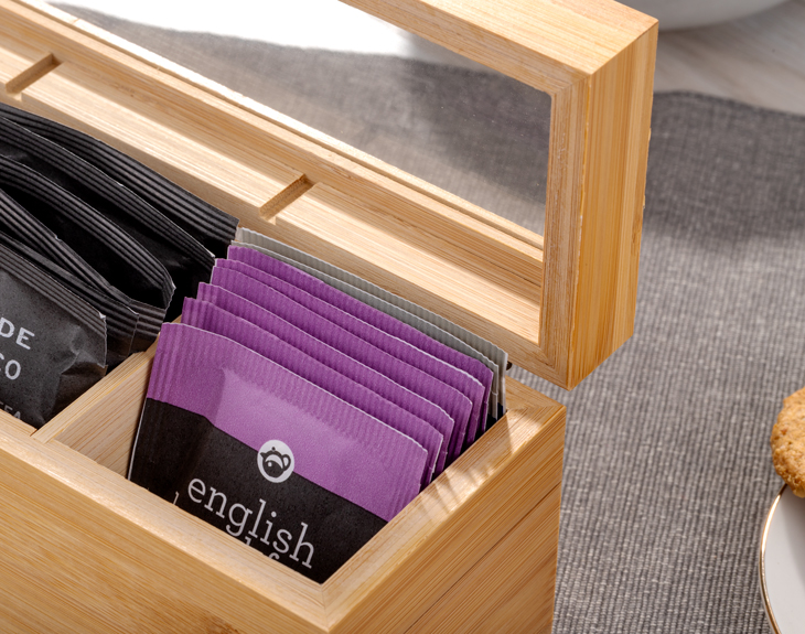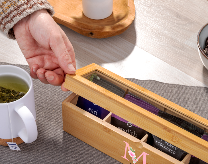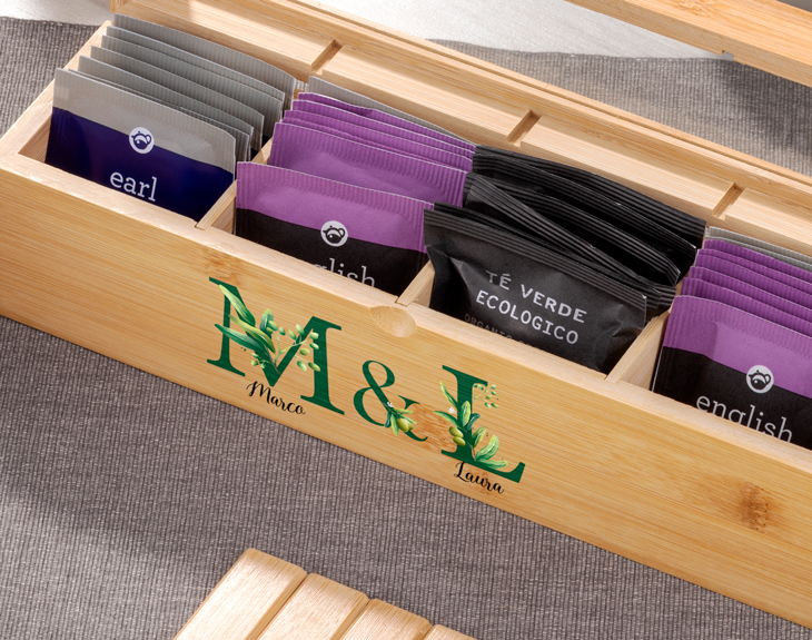 Tomarse un té bien calentito es una de las cosas más relajantes que podemos hacer. El té y las infusiones se han puesto muy de moda, se ha convertido en una de las bebidas que más triunfa entre la gente por la cantidad de sabores y tipo que podemos elegir. Por eso, si quieres hacerle el mejor regalo del mundo a esa persona amante del té, esta caja de madera personalizada es perfecta. Ideal para colocarla en tu cocina o incluso en la oficina y tener todas tus bolsitas de té organizadas y siempre a mano. Gracias a sus cuatro compartimentos, podrás guardar muchas bolsitas. ¡Es súper práctico! Si estás pensando en qué regalo hacer en un cumpleaños o evento cercano y esa persona no puede vivir sin su ración de té diaria, no hay mejor regalo que esta original caja de madera con un diseño precioso y de lo más elegante. Esta caja es súper útil, ya que su tamaño permite guardar muchas bolsitas y además cuenta con un cristal en la tapa para que puedas tener siempre tus bolsitas a la vista, sin tener que abrir la caja. Si no puedes esperar para utilizar esta súper caja, no te olvides que antes tienes que personalizar esta caja para té. En su diseño podrás añadir las iniciales que quieras, rodeadas de plantas y flores. Es todo un detallazo para esa persona tan especial, le encantará recibir este regalo personalizado y hecho a medida. Medidas: 29,5 x 9 x 7,8 cm. Importante: La caja no incluye tés. Importante: Las maderas tienen vetas y estas quedan reflejadas en la imagen.
