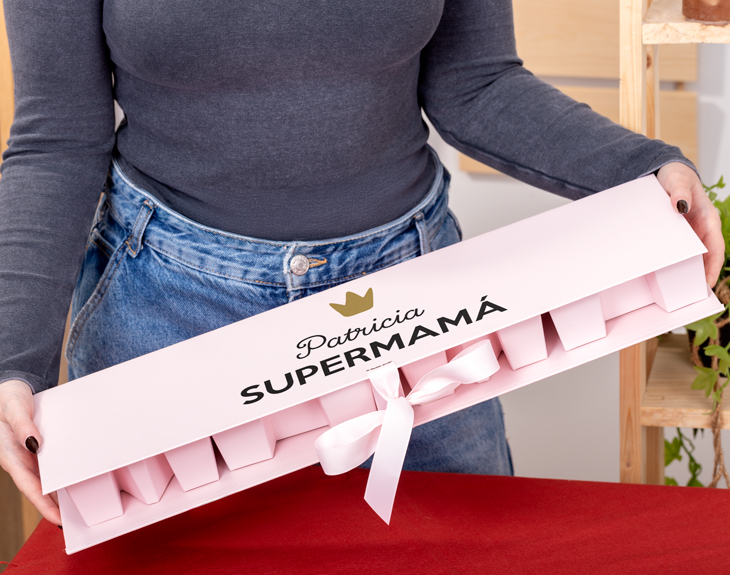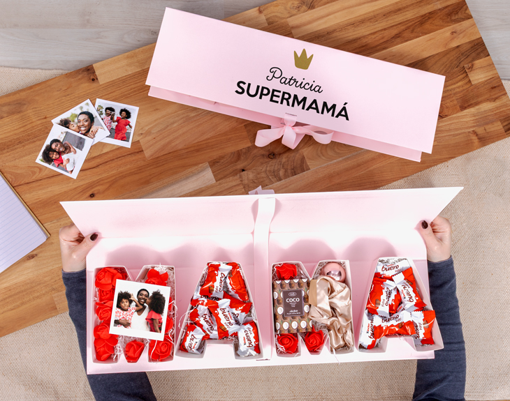 Se acerca el Día de la Madre y seguro que este año quieres sorprender a mamá con un regalo único y diferente. ¡Tenemos lo que necesitas! Nuestra caja premium rosa personalizada es perfecta para esta ocasión, porque con todo lo que incluye en su interior, dejarás a tu madre sin palabras cuando la reciba. No habrá mejor regalo que esta súper caja llena de cosas muy chulas. ¡Le va a encantar! Sabemos que a las madres hay que quererlas y consentirlas todos los días del año, pero esta fecha es una excusa para demostrarles lo importante que son para nosotros y no hay nada como hacerlo con este original regalo. No te conformes con una sola cosa porque en esta caja se esconden muchos detallitos que le robarán el corazón. Dentro encontrarás la palabra 'mamá' llena de cosas: unas polaroid, mini Kinder Bueno, un jabón con aroma a coco, un bálsamo labial y un scrunchie. Y por supuesto, no nos podemos olvidar del diseño de la caja que es lo más. Para personalizar esta caja, añádela al carrito y entra en el área de personalización. Una vez dentro podrás completar el diseño de la caja con el nombre de mamá y añadir vuestras fotos favoritas para que las convirtamos en estas preciosas polaroids. Nosotros nos encargamos de que tu madre reciba el regalo y pasé un Día de la Madre inolvidable. Medidas de la caja: 53,5 x 15,5 x 5,5 cm. Medidas de las letras: 13 x 14 cm aprox. Material: cartón.