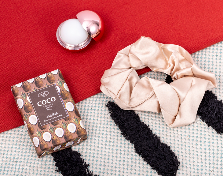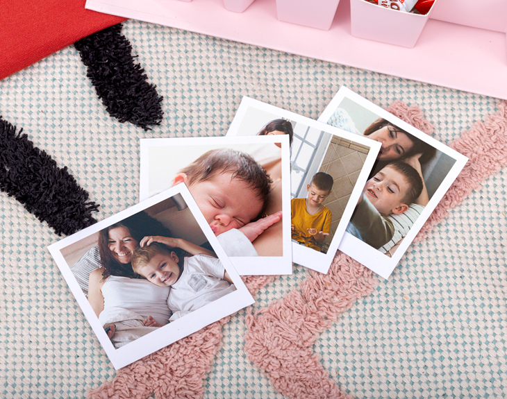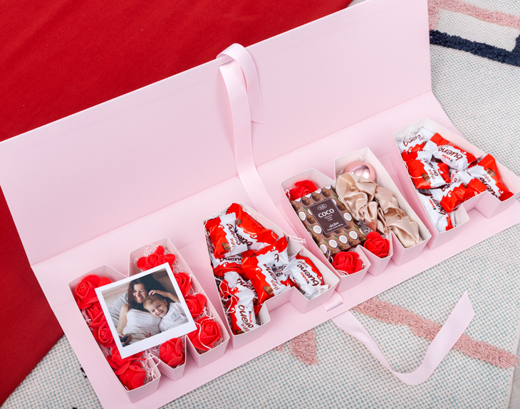 • Caja de cartón rosa mamá (53,5x15,5x5,5cm). • 4 fotos polaroid personalizadas. • 16 Mini Kinder Bueno. • Bálsamo labial redondo rosa. • Jabón de coco 75gr. • Scrunchie beige. • Tarjeta Recordatoria.