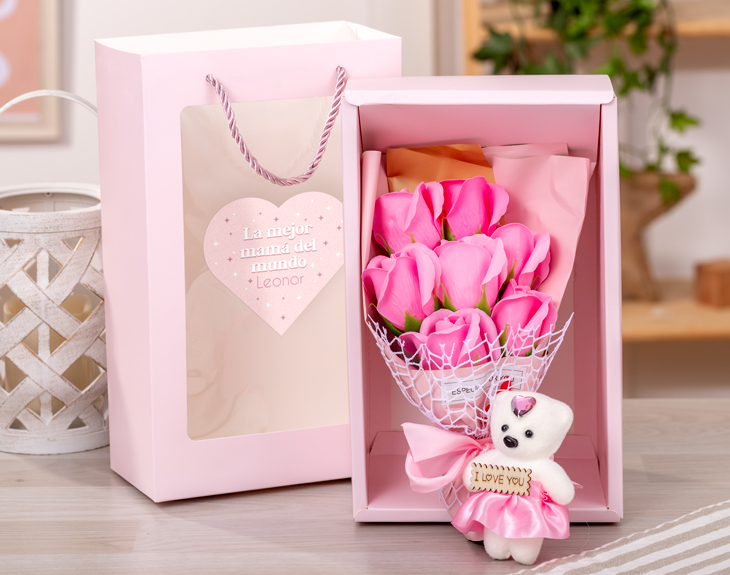 • Bolsa personalizada. • Ramo de flores artificiales aromáticas. • Osito "Love you". • Tarjeta recordatoria.