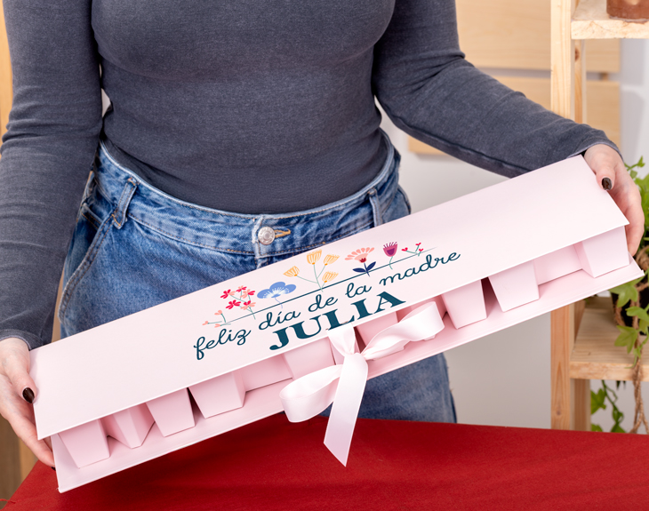 ¿Aún no tienes regalo para el Día de la Madre? No te preocupes que estamos aquí para salvarte. Esta fecha es el momento perfecto para regalarle a mamá esta preciosa caja rosa personalizada que además contiene muchas sorpresas en su interior. Si de verdad quieres triunfar en este día tan especial, no dudes que con esta espectacular caja lo conseguirás. ¡Mamá se quedará sin palabras! Deja de buscar porque has encontrado el regalo más original del mundo para mamá. ¿Por qué regalarle solo una cosa cuando puedes tener muchos detallitos con ella? Como puedes ver en la imagen, la palabra 'mamá' es la protagonista en el interior de esta caja. Y es que cada letra de esta palabra tiene un relleno diferente: mini rosas, mini Kinder Bueno, unas polaroid que podrás personalizar, un jabón con aroma de coco, un bálsamo labial y un scrunchie. ¡Ah! Y la caja también va personalizada con este precioso diseño de florecitas. ¡Es el regalo perfecto! ¿Quieres saber cómo puedes personalizar este kit para madres? ¡Es muy sencillo! Al añadir el producto al carrito entrarás en el área de personalización, desde donde podrás añadir tu fotos favoritas con mamá para convertirlas en auténticas polaroids y también escribir su nombre junto al diseño que aparecerá en la tapa de la caja. ¡Felicita a mamá por este día como se merece! Medidas de la caja: 53,5 x 15,5 x 5,5 cm. Medidas de las letras: 13 x 14 cm aprox. Material: cartón.