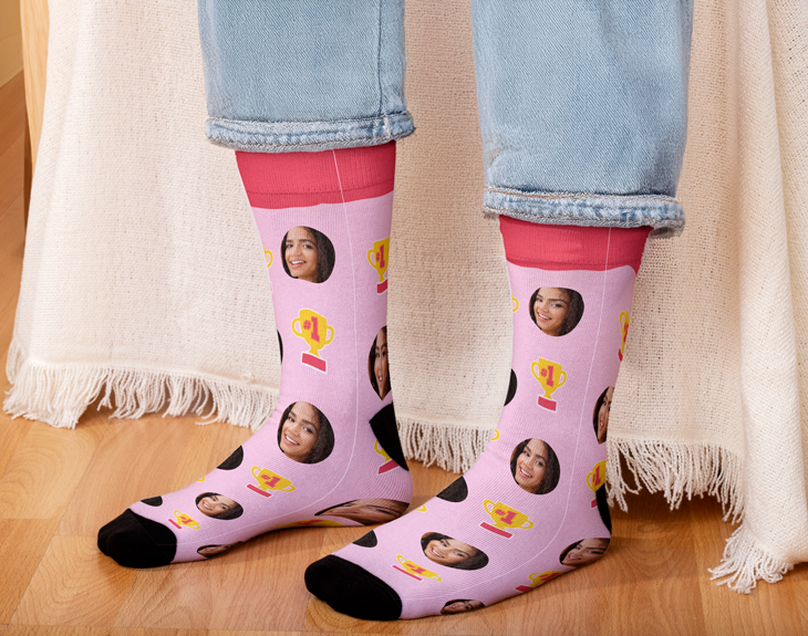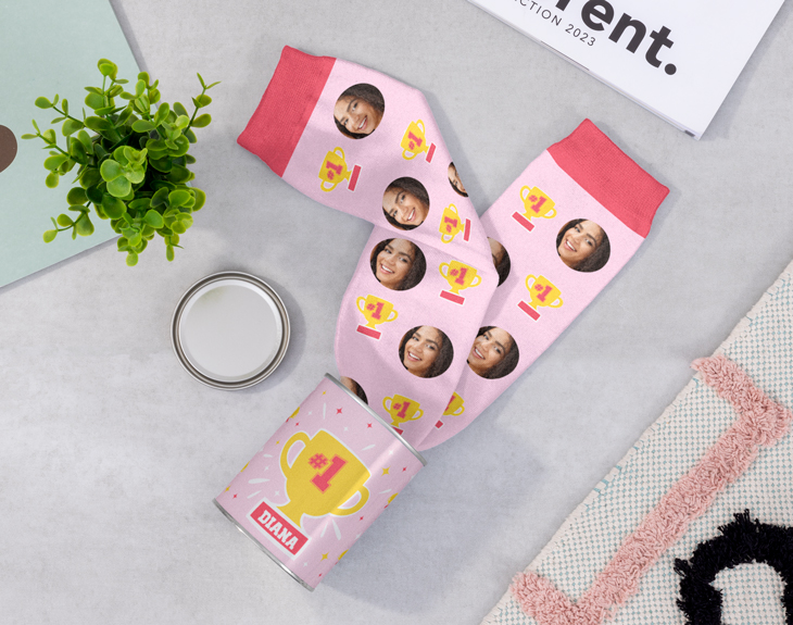 Si tu madre ha sido la mejor del mundo este año, ¡se merece un reconocimiento a la altura de su grandeza! ¿Qué mejor manera de sorprenderla que con unos calcetines personalizados con su cara? Un regalo divertido y original que seguro no podrá esperar a estrenar. Con un diseño "Trofeo de Mamá", podrás personalizar los calcetines con una foto de tu madre. ¡El resultado será increíble! Estos calcetines elásticos son de talla única, lo que los hace perfectos para cualquier mamá. Además, tienes la opción de comprar solo los calcetines o, si quieres hacerlo aún más especial, añadir una lata personalizada con su nombre, ideal para guardar este trofeo en su armario. Sin duda, ¡será un regalo original para el Día de la Madre que no olvidará! IMPORTANTE: Talla: única Medidas de cada calcetín: 41x9 cm. Medidas de la caja: 13,5x10,5x4 cm. Medidas de la lata: 11x8,5 cm. Material: poliéster.