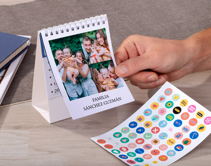 • Calendario de mesa personalizado. • Plancha de stickers (opcional). • Tarjeta recordatoria.
