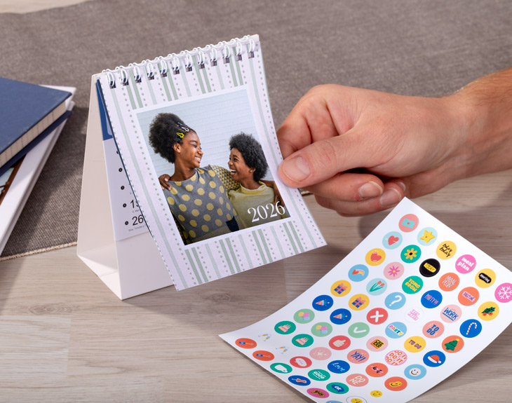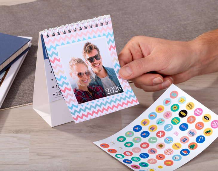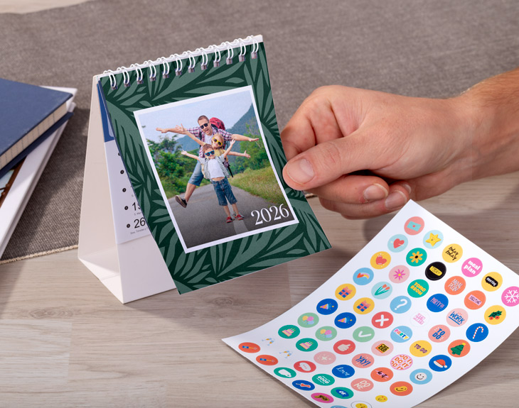 • Calendario de mesa personalizado. • Plancha de stickers (opcional). • Tarjeta recordatoria.