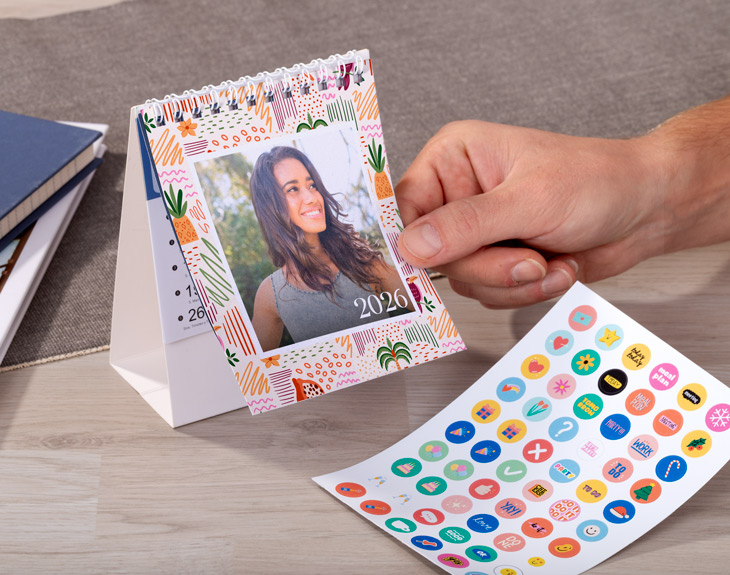 ¡Haz check a todos tus planes y empieza el año organizando tu tiempo con un toque especial! Con este calendario de mesa personalizado, tendrás siempre a mano tus tareas, citas y momentos importantes, para que no se te escape nada. Gracias a su diseño alegre, colorido y lleno de buen rollo, 2026 puede ser el año perfecto para cumplir todos esos sueños que llevas tiempo imaginando. Lo más especial de este calendario es que puedes personalizar la portada con la foto que tú elijas. Además, tienes varios fondos de colores disponibles para que escojas el que más te guste y mejor encaje contigo. Empieza el año con energía, motivación y una gran sonrisa. Y si quieres convertirlo en un detalle aún más especial, añade una plancha de stickers temáticos con los que podrás decorar cada mes como más te guste. Sin duda, es un regalo original y práctico para sorprender esta Navidad o el Día de Reyes. Ideal para regalar a esa persona que adora tenerlo todo bajo control... ¡o que quiere empezar a hacerlo! Personalizar tu calendario es facilísimo: añade el producto al carrito, accede al área de personalización, elige el fondo que más te guste y sube tu foto favorita. En pocos pasos tendrás un detalle especial, listo para regalar (o para ti, que también te lo mereces).