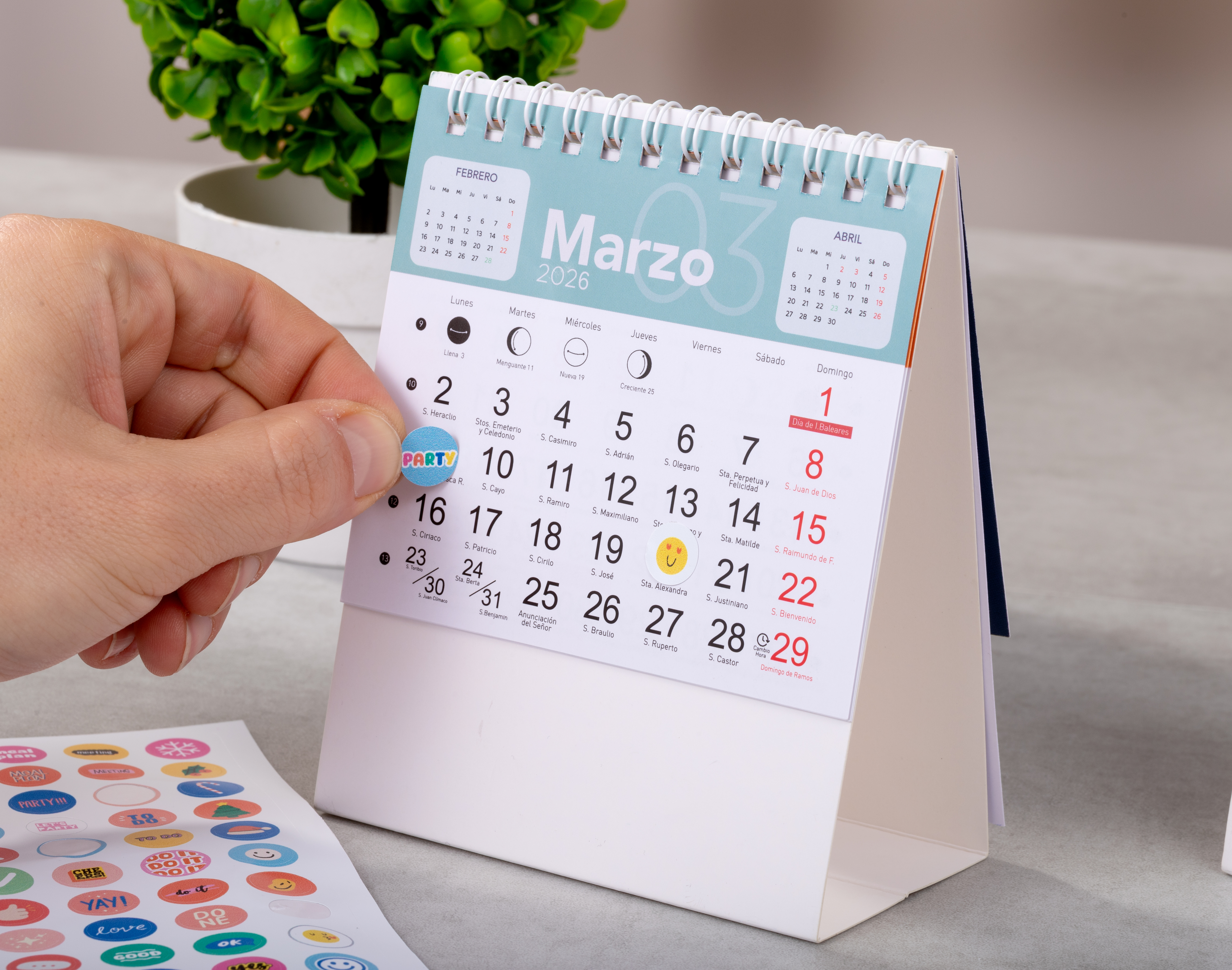 • Calendario de mesa personalizado. • Plancha de stickers (opcional). • Tarjeta recordatoria.