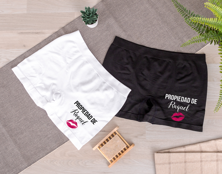 ¿Estás buscando un regalo especial para tu novio? ¡Te traemos la opción perfecta! Se trata de un divertido calzoncillo personalizado con la frase “propiedad de” y tu nombre. Así no quedará ninguna duda, ¡es tuyo y solo tuyo! Seguro que es el detalle más sexy y original que ha recibido nunca. ¡Ideal para estrenar en una velada romántica! Si este año quieres triunfar en vuestro aniversario, en San Valentín, o en cualquier otra fecha especial, con este regalo el acierto está asegurado, ¡el mejor detalle para parejas! Además, no solo es original, ¡también es super cómodo! No hay duda, a partir de ahora se convertirá en su ropa interior favorita. Están fabricados con poliamida, un tejido elástico y transpirable, y cuentan con una cinta elástica para que se ajusten perfectamente a la cintura. Además, puedes escoger entre diferentes tallas (M, L y XL), así todo el mundo podrá disfrutar de estos increíbles calzoncillos personalizados con una frase divertida. También es una super idea si buscas un regalo gracioso para novios, por eso, si tienes unos amigos que están a punto de casarse, este detalle está hecho para ellos. No se nos ocurre mejor calzoncillo para bodas, ¡harás que su luna de miel sea aun más inolvidable! Talla: - Talla M: 33,5 x 25 centímetros. - Talla L: 36 x 26 centímetros. - Talla XL: 43 x 29 centímetros. Material: poliamida (90%) y elastano (10%). Color: negro. Importante: se puede lavar a una temperatura máxima de 30 grados. No es recomendado usar lejía ni secarlo en la secadora. No se debe planchar.