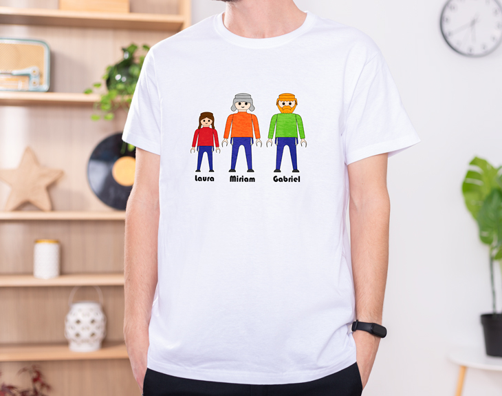 ¿En casa sois amantes de los Playmobil?¿Cuando eráis pequeños os pasabais tardes y tardes jugando con estos divertidos muñecos? ¡Entonces nuestra camiseta personalizada con la familia Playmobil tiene vuestro nombre. Para personalizarla y hacer que sea la camiseta más especial del mundo solo tenéis que elegir los personajes que mejor representen a cada miembro de la familia y decirnos vuestros nombres...¿No os parece una idea divertidísima? Material: - Algodón: 100% algodón - Tacto algodón: 100% poliéster cotton touch. Ligeramente translúcida. - Técnica: 100% poliéster (Colores solo disponibles en algodón) Importante: nuestro equipo de personalización se encargará de ajustar la distribución de los personajes en el producto en función de su tamaño para que se vean lo mejor posible. Importante: Las medidas son aproximadas, pueden variar 5cm por encima o por debajo.