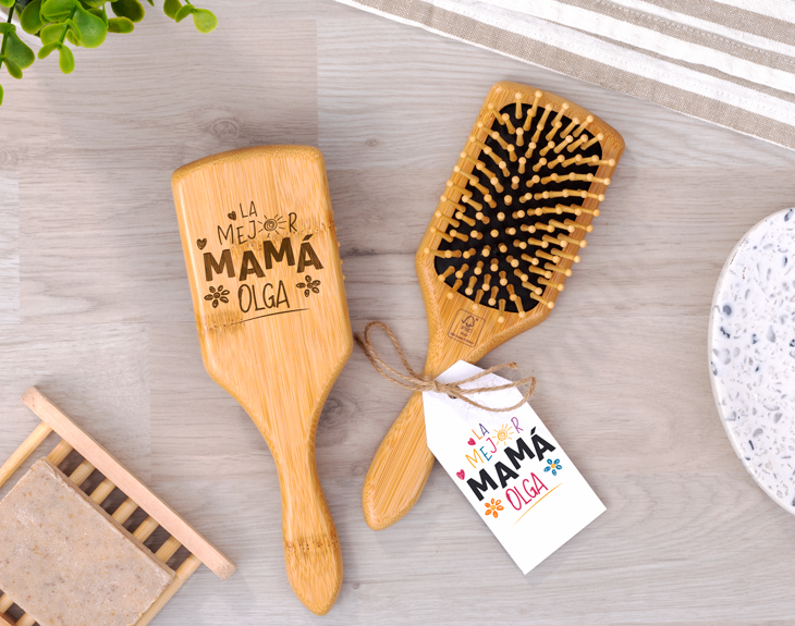 Las madres son, sin duda, las personas más especiales del mundo. Nos cuidan, nos miman, nos aconsejan... y siempre están ahí cuando más las necesitamos. Este Día de la Madre, es el momento perfecto para devolverles un poquito de todo ese amor con un detalle pensado especialmente para ellas. Si tu madre es coqueta, cuida su melena con dedicación y le encanta mimarse, ¡tenemos el regalo ideal! Nuestro cepillo para el pelo de bambú personalizado con nombre no solo es bonito y práctico, sino también un recuerdo inolvidable. Inspirado en los dibujos de los peques, este cepillo hará que se le ilumine la cara nada más verlo. El nombre grabado en el cepillo lo convierte en una pieza única, y además incluye una etiqueta personalizada a juego, perfecta para completar el detalle. Sus cerdas anchas y suaves están pensadas para desenredar sin tirones, cuidando el cabello de mamá con delicadeza y evitando daños. Ideal para todo tipo de cabello, incluso el más sensible. Y personalizarlo es muy fácil. Agrega el producto al carrito y accede al área de personalización. Allí escribe el nombre que quieras incluir tanto en el cepillo como en la etiqueta. ¡el resultado será increíble! Tendrás un regalo original para mamá. Medidas: 20 x 6,5 cm.
