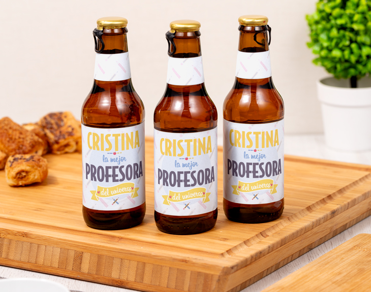 Aprovechad el final de curso para darle una gran sorpresa a vuestra profe para agradecerle todo lo que os ha enseñado. Con este pack de cervezas personalizadas daréis en el clavo. Esta es una bonita y original forma de darle las gracias a vuestra profe por todo su trabajo y por su infinita paciencia. En este pack de cervezas utilizamos como base seis cervezas San Miguel Especial, una bebida refrescante y muy auténtica para que pueda disfrutar de una buena conversación y cervecita fresquita. Además, podréis personalizar la etiqueta con su nombre. ¿No os parece una idea genial?