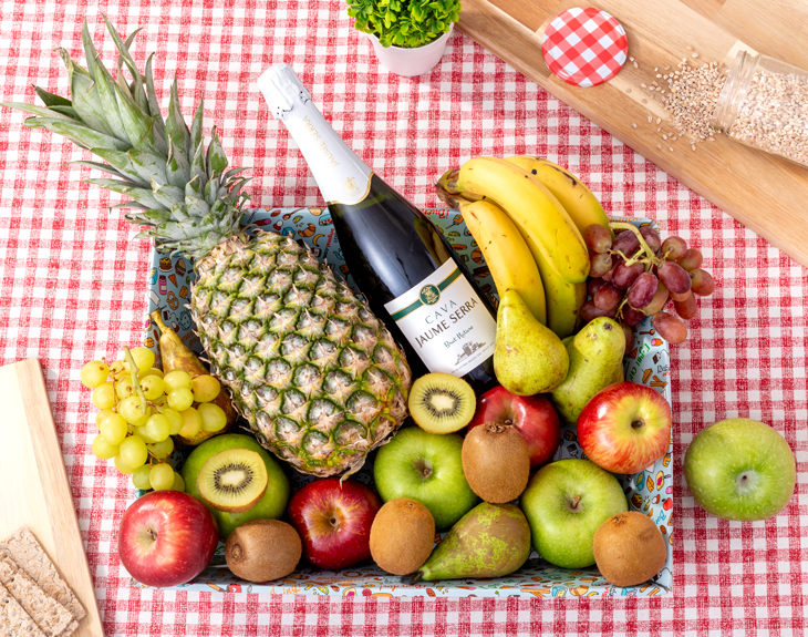 • Cesta de cartón. • Piña Golden. • 4 plátanos de Canarias 1ª. • 4 kiwis Hayward. • 4 manzanas verdes Golden. • 4 manzanas rojas Royal. • 4 peras Conferencia. • 1 racimo de uvas verdes. • 1 racimo de uvas rojas. • 1 botella de Cava Jaume Serra 750ml. • Tarjeta recordatoria. Importante: en función de la época del año, la variedad de uva será modificada. ¿Cómo incluir los productos opcionales? Una vez hayas seleccionado el tipo de desayuno, en el apartado de adicionales (paso 2) podrás añadir todos los productos opcionales que quieras.