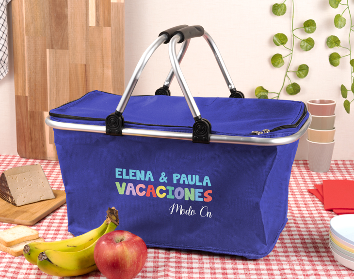 Todos estamos expectantes por empezar las vacaciones. Después de un año durísimo en el que hemos tenido tantos altos como bajos, ha llegado el momento de dejar la mente en blanco y sentarse en la playa, rodeado de tus seres queridos. ¿Qué es lo único que falta en esta imagen tan soñada? ¡Vuestra comida y bebida favorita! Con esta cesta plegable personalizada, podrás guardar todo lo que necesites para ese maravilloso día en la arena. Esta cesta con asas con diseño de vacaciones está pensada para que toda la familia guarde los míticos filetes de pollo empanados y los icónicos refrescos que todos llevábamos en los días de verano en la playa. Esta cesta está hecha de tela y se puede plegar. Esto nos vendrá de lujo para guardarla cuando no la utilicemos en cualquier rincón, ya sea en casa o en el maletero del coche. Al contar con aislamiento térmico, todos tus alimentos mantendrán su temperatura sin problema. Este regalo original para las vacaciones os vendrá de lujo para empezar este tiempo de relax con el mayor confort posible. En el interior del área de personalización encontrarás el diseño de esta cesta plegable. Solo tendrás que añadir el producto al carrito y, al entrar en el diseñador, escribir la personalización que quieras en el cuadro de texto que encontrarás en la plantilla. ¡Un regalazo para todas vuestras vacaciones en familia! Medidas: 47,5 x 27,5 x 21 cm. Material: tela.