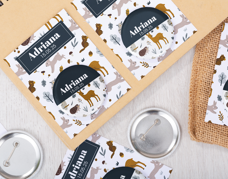 En la Primera Comunión de tu hijo/a todo tiene que salir perfecto, porque todos los preparativos son igual de importantes. Por eso, no puedes olvidarte de sorprender a tus invitados con un detallito para que puedan recordar siempre este día. Nuestras chapas personalizadas con cartoncito son todo un acierto para este tipo de ocasiones y te aseguramos que triunfarás con todos. Aprovecha esta gran celebración para repartir entre tu familia y amigos estas divertidas y originales chapas con tarjeta que les van a encantar. Gracias a nuestro selector de cantidad, vas a poder elegir cuántas unidades quieres y cómo las vas a personalizar, todas iguales o cada una con un diseño diferente. Además, cada chapa va enganchada a un cartoncito, por lo que tendrás que personalizar ambas cosas. ¡Es lo más! Toca personalizar estas chapas para convertirlas en un detalle súper especial. Entra en el área de personalización y completa este precioso diseño de animalitos con el texto que quieras. Es muy fácil y no tardarás nada. ¡Tendrás el mejor regalo para la Comunión!