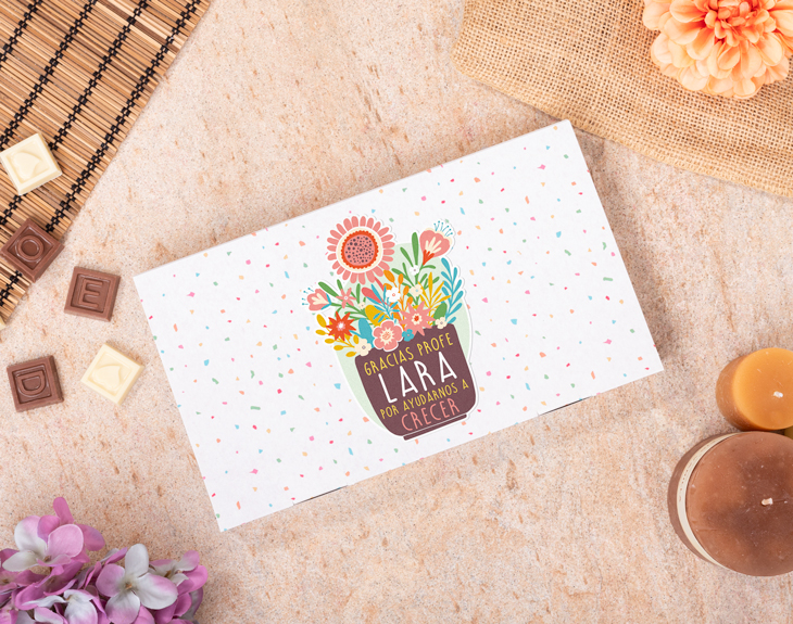 Hay profes que marcan un antes y un después en nuestras vidas. Gracias a su apoyo, su paciencia, su sabiduría y su amor consiguen hacernos crecer a pasos agigantados. Si este año habéis tenido la suerte de dar clase con alguien así, este regalo original tiene su nombre. Y es que, se merece tener un reconocimiento muy especial por la gran labor que hace a diario. ¿Y qué mejor manera que con un mensaje así de dulce? Basta con que nos digáis su nombre y el texto que queréis añadir con letras de chocolate y podréis hacerle un detalle increíble. ¡Seguro que le hace muchísima ilusión tener un regalo así de sus alumnos favoritos! Tenemos disponibles dos tipos de chocomensajes, uno de 24 caracteres y otro de 32. Medidas: - Tamaño de cada letra de chocolate: 2,3cm x 2,3cm - Tamaño de la caja confetti: 23cm x 11cm x 2,5cm