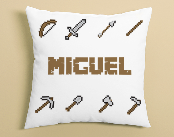 ¿Te pasas la vida crafteando? En ese caso, este cojín personalizado es para ti. Dinos tu nombre y lo ponemos entre las herramientas más típicas del Minecraft, para que te apoyes sobre algo blandito en las largas tardes de domingo haciendo construcciones imposibles en tu juego favorito.