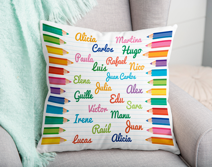 ¿Queréis sorprender a vuestro profe con un increíble regalo para agradecerle todo lo que ha hecho por vosotros durante este curso? Nuestro cojín personalizado "Lápices de colores" es el detalle perfecto Se trata de un increíble diseño en el que podréis poner el nombre de todos los alumnos para que se lleve un bonito recuerdo de vosotros...¡Se emocionará muchísimo al verlo! Además, es perfecto para demostrarle que valoráis muchísimo toda la dedicación, el cariño y la paciencia que ha puesto con vosotros.