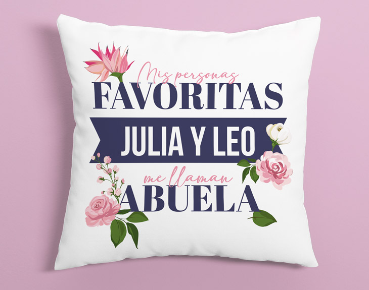 Dicen que las abuelas son las mejores personas que hay y no les falta razón porque es totalmente cierto. Una abuela es la persona que siempre está ahí para su familia cuando más la necesitan. Cuidando a los nietos, haciendo la comida de los domingos para toda la familia y siendo el pilar fundamental de cualquier casa. Por todo eso y más, se merecen un detallito tan mono como este cojín personalizado. Su diseño dejará con la boca abierta a tu abuela que no se esperará un regalo tan bonito como este. ¡Le encantará! Si quieres sorprender a tu abuela con un regalo único, aprovecha el Día de la Madre o su cumpleaños para entregarle este original cojín. Se convertirá en el accesorio que no puede faltar encima de su cama o del sofá para decorar o cada vez que quiera descansar un poco. Además, este cojín viene listo para usar porque trae relleno y funda, donde irá impreso el diseño. Para terminar este precioso regalo, toca personalizar tu propio cojín para tu abuela. Añade el producto al carrito, entra en el diseñador y ponte manos a la obra con tu cojín. Lo único que tienes que hacer es escribir los nombres que quieras en el espacio vacío y listo. ¡El regalo que dejará sin palabras a cualquier abuela! Pero si este diseño te ha gustado, podrás elegir la opción del pack que incluye cojín y taza personalizados. Podrás personalizar ambos productos iguales para hacer un regalo único a tu abuela. Porque si es guay llevarse solo un producto, imagínate poder llevarte dos. ¡Es genial!