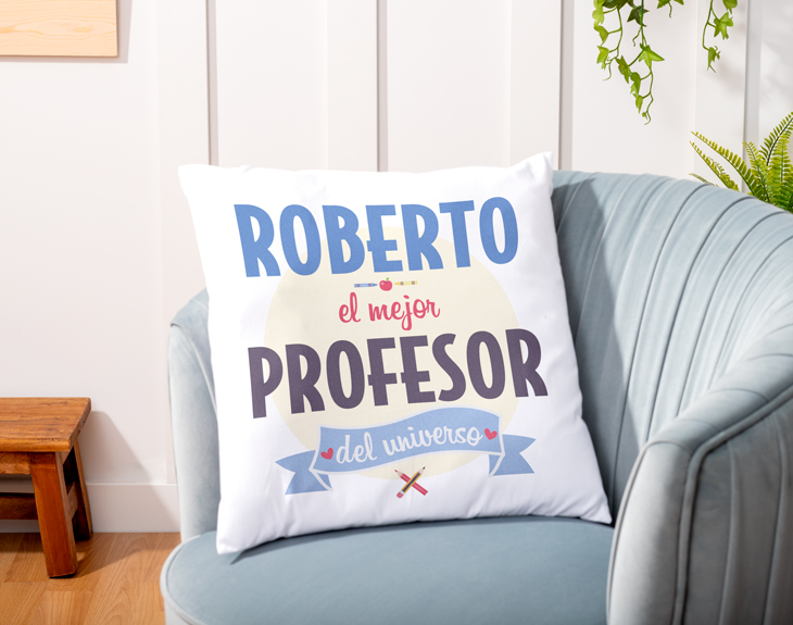 Los profesores son un pilar fundamental en nuestras vidas, no solo nos enseñan materias importantes pero también valores que nos acompañarán para siempre. Si queréis darle las gracias a vuestro o vuestra profesora por todo lo que os ha enseñado, este cojín personalizado es el regalo perfecto. Este cojín es una bonita forma de decirle lo mucho que valoráis todo su esfuerzo y su paciencia infinita. Seguro que le hace mucha ilusión que sus alumnos le hagan un detalle tan especial como este. Simplemente nos tenéis que decir el nombre de vuestro profe y nosotros nos encargaremos de insertarlo en este diseño tan divertido. Le encantará y lo guardará con muchísimo cariño.