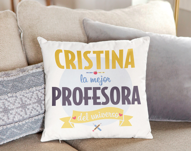 Nuestro cojín personalizado Mejor profesora del universo es perfecto para dejar a vuestra profe sin palabras. Aprovechad el final de las clases para sorprender a vuestra profe de una forma original y divertida. Este cojín es una forma diferente de darle las gracias por todo lo que habéis aprendido en sus clases. Simplemente nos tendréis que decir el nombre de vuestra profe y nosotros nos encargaremos del resto. Seguro que a vuestra profe le hace mucha ilusión y guardará este cojín con muchísimo cariño. ¿No te parece una idea genial?