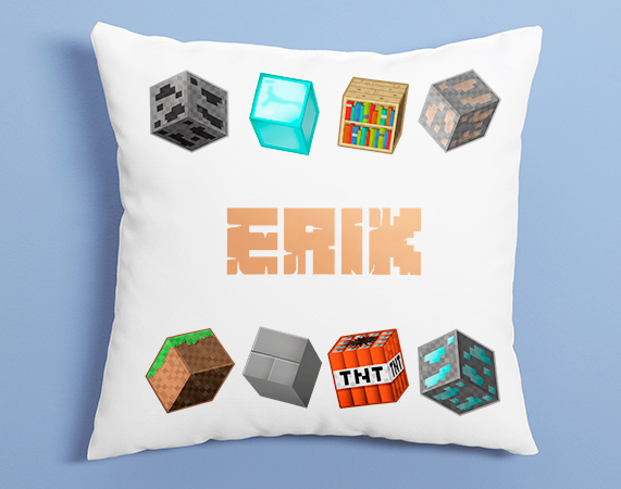 El regalo perfecto para todo jugador de Minecraft que se precie: un cojín personalizado con los bloques más típicos del juego y el nombre que tú nos digas en el medio. ¡Seguro que le encanta!